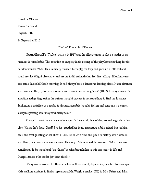 1916 was an era within United States when women were seen as second-class citizens. Trifles is a one-act play by Susan Glaspell. Hale is the character who introduced the word trifle with this quote Well women are used to worrying over trifles Glaspell 2015.